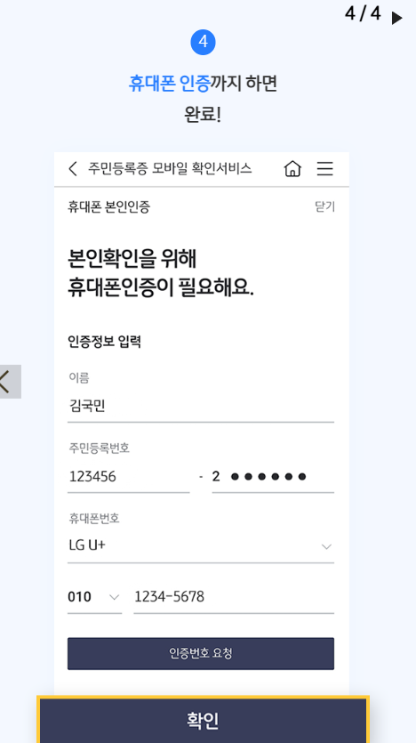 | 3 | 얼굴‧주민번호 확인 | 휴대폰 카메라가 자동 실행됩니다. |